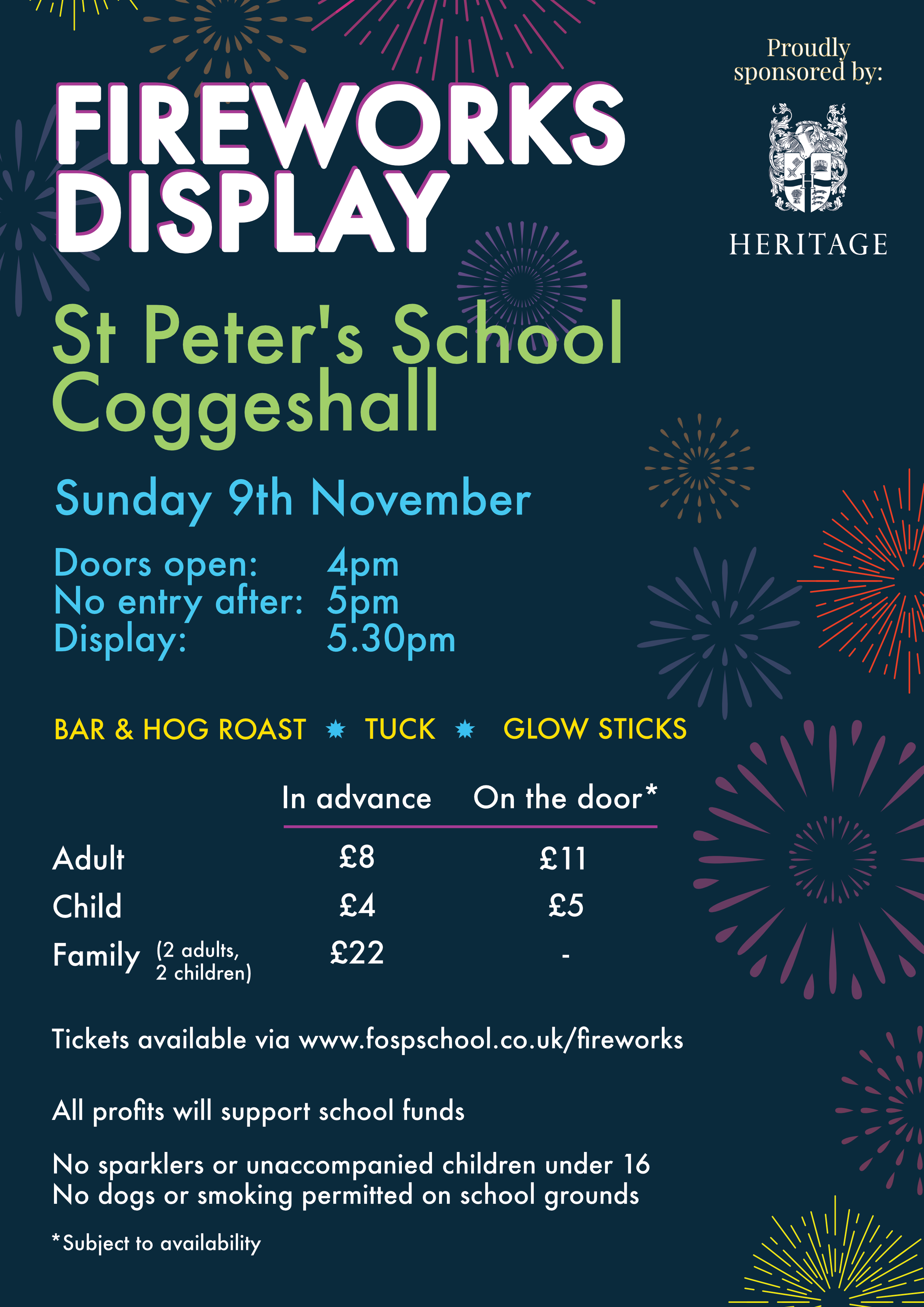 The annual St Peter’s Fireworks Display will this year be on Sunday 9th November! There will be a bar, BBQ, a tuck stall and glow sticks. Tickets will be priced as follows:
